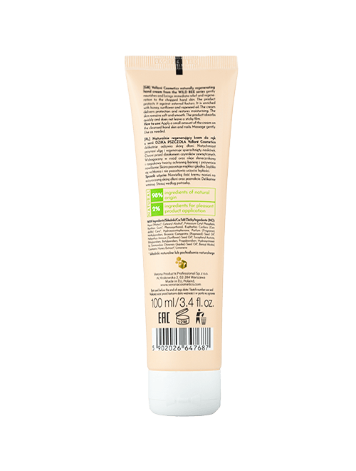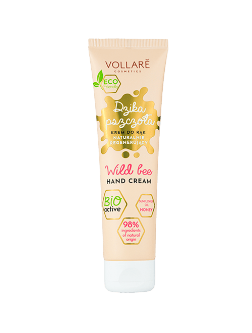 The naturally regenerating hand cream from the Wild Bee line by Vollare Cosmetics offers gentle nourishment. The cream provides instant relief and regenerates the cracked hand skin. Protects against the negative effects of external factors. The composition enriched with honey and oils from sunflower and rapeseed creates a protective barrier and restores moisture. The skin appears soft and smooth. The non-sticky formula absorbs quickly.